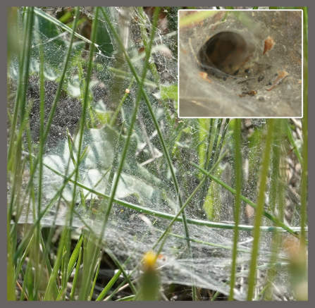 Toile sur la végétation basse de l'Agélène à labyrinthe (Agelena labyrinthica) et sa loge en entonnoir.