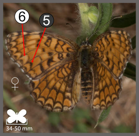 Détails déterminants chez la Mélitée des Centaurées (Melitaea phoebe) femelle en vue dorsale.