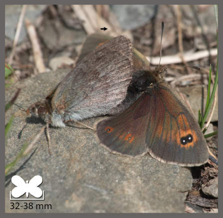Détails déterminants chez le Moiré lustré (Erebia arvernensis) de profil. En haut à gauche l'aile portérieure gris clair du mâle.