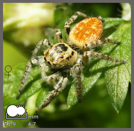 Le Saltique orangé (Carrhotus xanthogramma) est une araignée sauteuse aux couleurs variables chez la femelle contrairement à celles du mâle qui sera donc le plus facile à reconnaitre.
