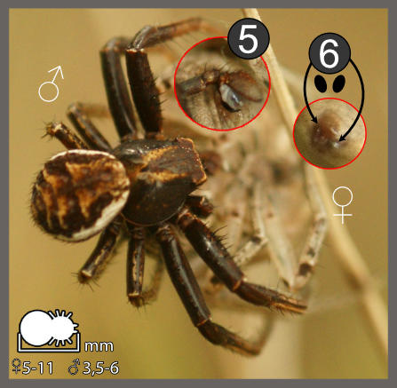 Accouplement de Xysticus cristatus-kochi avec un gros plan sur le pédipalpe du mâle (5) et l'épigyne de la femelle (6).