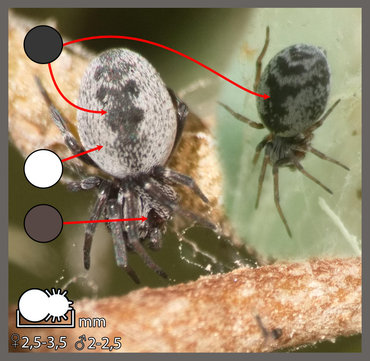 On retrouve dans cette section, des araignées très petites (quelques millimètres sans les pattes) tissant des toiles sur une simple feuille. Elles se tiennent souvent sous la toile à la surface de la feuille, ce qui complique davantage leur identification.