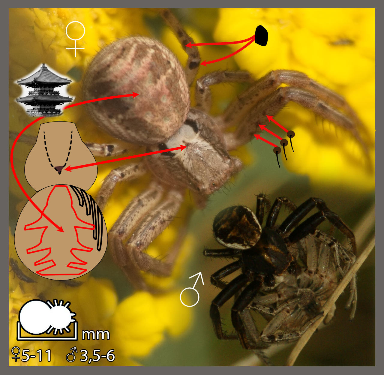 Thomise tricolore Diaea dorsata (3-6 mm) Thomise à trois taches Ebrechtella tricuspidata (3-6 mm) Hériée velue Heriaeus hirtus (5-9 mm) Hériée oblongue Heriaeus oblongus (5-9 mm) Thomise variable Misumena vatia (3-11 mm) Thomise tronqué Pistius truncatus (4-9 mm) Thomise rayé Runcinia grammica (4-8 mm) Thomise Napoléon Synema globosum (4-7 mm) Thomise chargé Thomisus onustus (2,5-7 mm) Tmarus Tmarus sp. (3,5-6 mm) Xysticus cristatus-kochi Xysticus cristatus-kochi (3,5-11 mm) Xysticus lanio Xysticus lanio (4-7 mm)