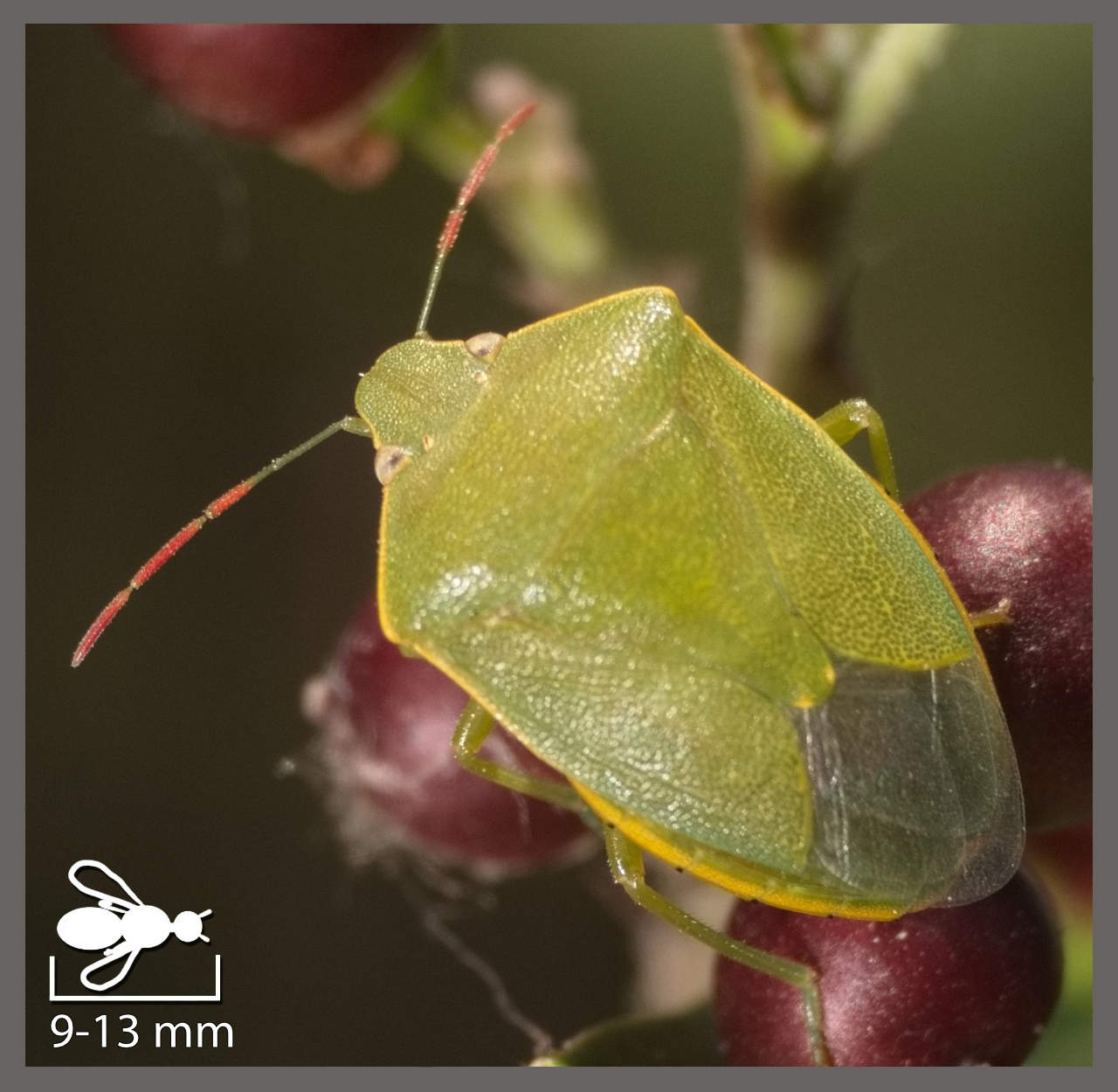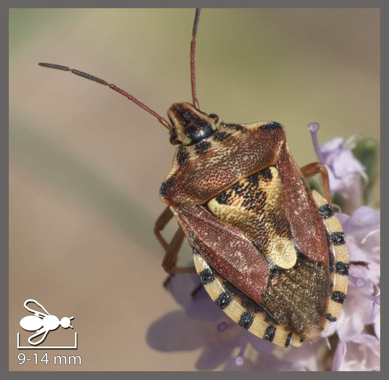 Punaise nez-de-rat Aelia acuminata (6-8 mm) Punaise diabolique Halyomorpha halys (12-17 mm) Pentatome méridional Carpocoris mediterraneus (10-16 mm) Pentatome pudique Carpocoris pudicus (10-14 mm) Codophile variable Codophila varia (9-14 mm) Pentatome des baies Dolycoris baccarum (10-15 mm) Punaise des Pins Holcogaster fibulata (4,5-8,5 mm) Péribalus étroit Peribalus strictus subsp. strictus (8-10,5 mm) Starie soyeuse Staria lunata (7-8 mm) Stagonome des Sauges Stagonomus amoenus (6-8 mm) Pentatome contrasté Acrosternum heegeri (9-13 mm) Punaise verte ponctuée Nezara viridula (12-15 mm) Punaise verte Palomena prasina (12-16 mm) Punaise nébuleuse Rhaphigaster nebulosa (14-16 mm) Punaise de l'ajonc Piezodorus lituratus (10-12 mm) Punaise des gaillets Dyroderes umbraculatus (7-9 mm) Sciocore macrocéphale Sciocoris macrocephalus (6-8 mm) Sciocore de la Crapaudine Sciocoris sideritidis (5-7 mm) Punaise potagère Eurydema oleracea (5-8 mm) Punaise décorée Eurydema ornata (7-9 mm) Punaise rouge du chou Eurydema ventralis (6-8 mm) Ancyrosome lignée Ancyrosoma leucogrammes (6-8 mm) Punaise arlequin Graphosoma italicum (8-12 mm) Graphosome ponctué Graphosoma semipunctatum (8-12 mm) Pentatome de la nigelle Ventocoris rusticus (7,5-10 mm)