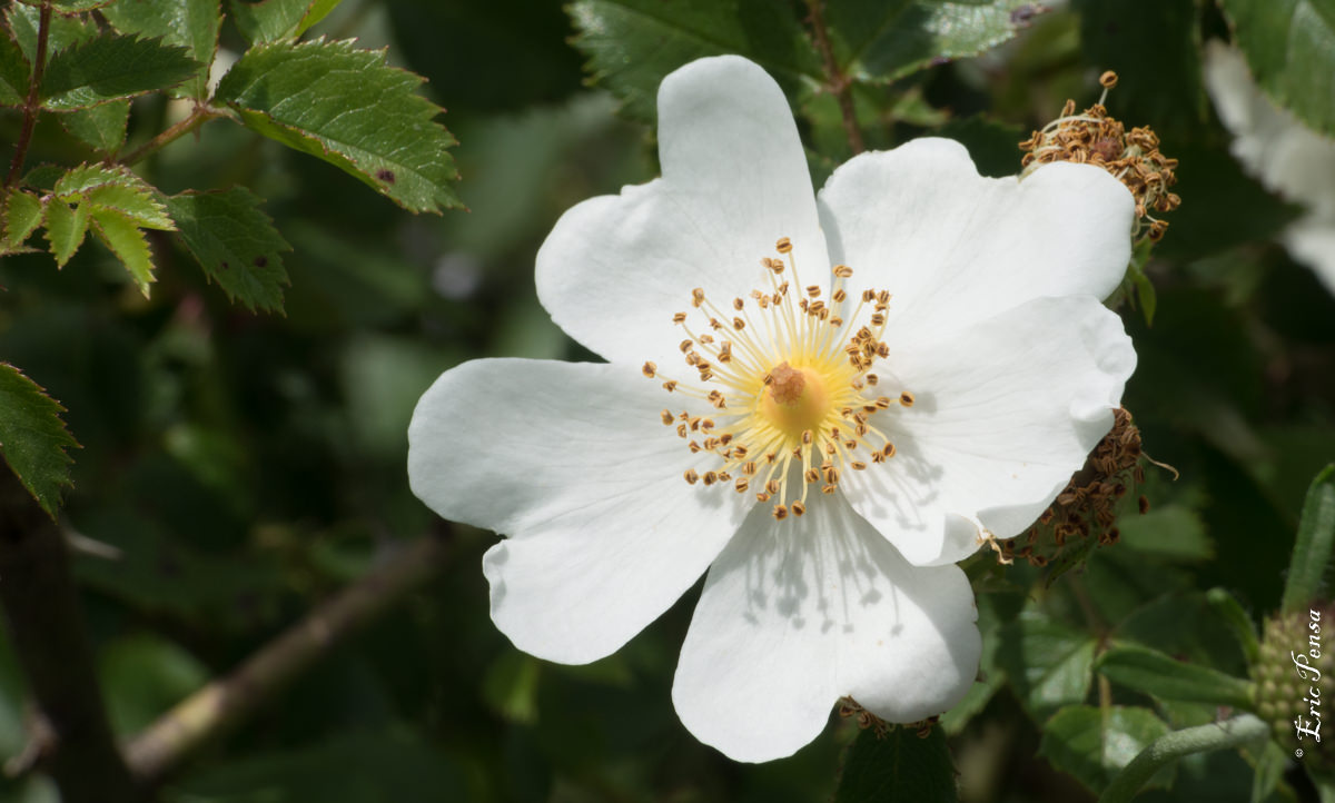 Chacun arbore fièrement ses belles fleurs à cinq pétales et sa multitude d'étamines entourant un drôle de pistil semblant incomplet (son ovaire est dissimulé en dessous). Les Églantiers sont en fleurs depuis quelque temps et autant vous dire que leur distinction n'est pas facile. Chez ces rosiers sauvages, tout compte pour séparer les espèces. De la fleur au fruit en passant par la feuille et les aiguillons, tous les détails sont importants. Avec des fleurs blanches, de forts aiguillons et des feuilles portant en dessous de petites glandes rouges, l'Églantier agreste (Rosa agrestis) fait partie des exceptions faciles à déterminer.