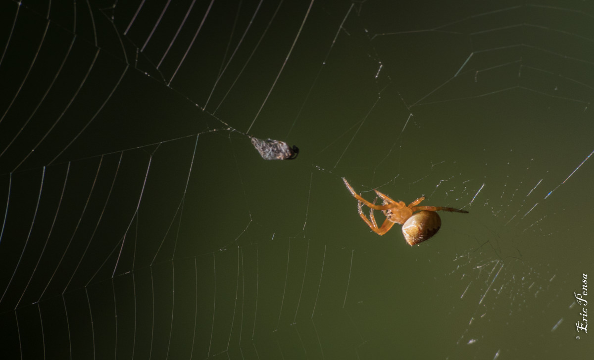 Pendant ce temps, jour après jour, millimètre par millimètre, les jeunes Épeires diadèmes grandissent en respectant les règles géométriques de la construction de toile de leur famille. Celle-ci ne faisait que quelques millimètres, mais sa toile était la copie conforme de celle des adultes, bien géométrique et efficace pour la capture de proies adaptées à sa petite taille.