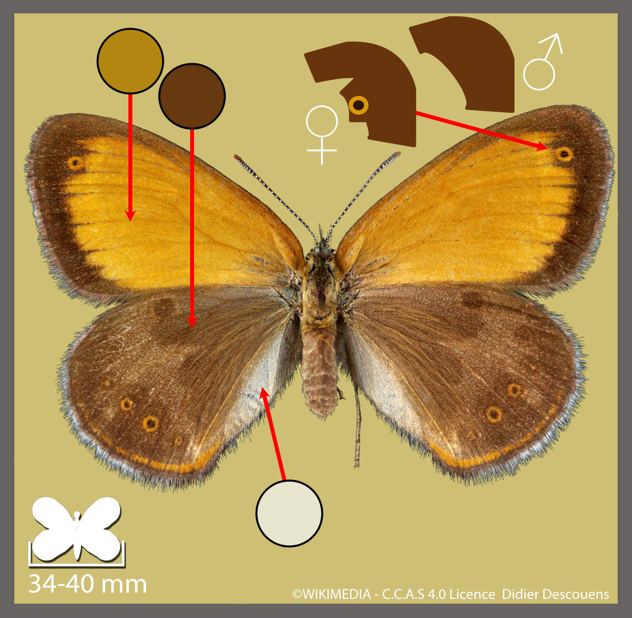 On retrouve dans cet ensemble des espèces de papillons orange ou marron +/- uni aux ailes largement bordées de couleur sombre, au moins sur les ailes antérieures Le Céphale Coenonympha arcania (34-40 mm) Le Fadet commun Coenonympha pamphilus (23-33 mm) L' Ocellé rubané Pyronia bathseba (35-38 mm) L' Ocellé de la canche Pyronia cecilia (30-32 mm) L' Amaryllis Pyronia tithonus (35-40 mm)