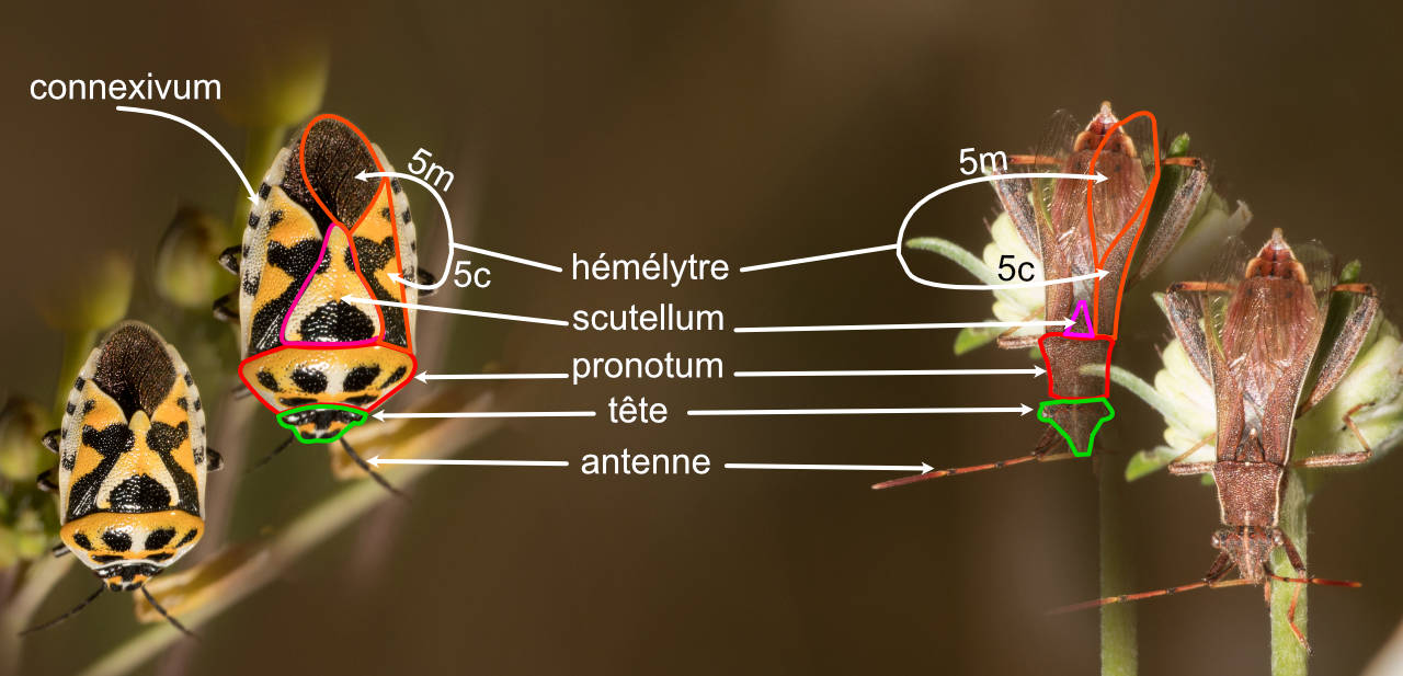 Les punaises se reconnaissent à leurs hémélytres formés d'une partie coriace (5c) comme les élytres des coléoptères, suivie d'une partie membraneuse (5m) comme les ailes. Il protège une seconde paire d'ailes qui servent au vol. Quelles soient piqueuses de plantes ou carnivores, elles se nourrissent toutes de sucs qu'elles prélèvent à l'aide d'un rostre piqueur. La reconnaissance des familles et des espèces repose sur l'observation de la forme de la tête, des antennes (nombre d'articles, épaisseur et couleurs de ces derniers), du pronotum, du scutellum, des hémélytres et du bord visible du dos de l'abdomen, le connexivum et enfin des pattes.