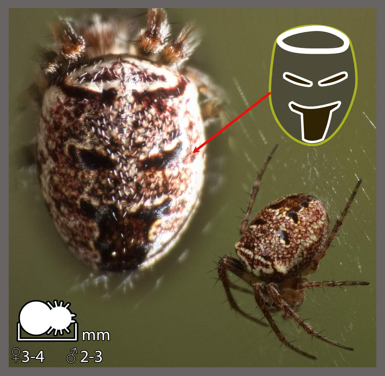 Épeire armide Aculepeira armida (6-18 mm) Épeire des bois Aculepeira ceropegia (7-14 mm) Épeire de velours Agalenatea redii (4-7 mm) Épeire angulaire Araneus angulatus (10-19 mm) Épeire diadème Araneus diadematus (4-18 mm) Épeire pâle Araneus pallidus (14-17 mm) Épeires concombre Araniella sp. (3-6 mm) Argiope frelon Argiope bruennichi (4-15 mm) Argiope lobée Argiope lobata (6-22 mm) Cyclose d'Algérie Cyclosa algerica (4-7 mm) Cyrtarachne ixodoides Cyrtarachne ixodoides (5-7 mm) Épeire des agaves Cyrtophora citricola (2-15 mm) Épeire à bosses Gibbaranea bituberculata (5-6 mm) Épeire des roseaux Larinioides cornutus (5-12 mm) Épeire des ponts Larinioides sclopetarius (8-14 mm) Mangora petite bouteille Mangora acalypha (2,5-4 mm) Épeire fougère Neoscona adianta (4-7 mm) Épeire des fissures Nuctenea umbratica (8-14 mm) Diodie tête de mort Zilla diodia (2-4 mm) Épeire des fenêtres Zygiella x-notata (4-7 mm)
