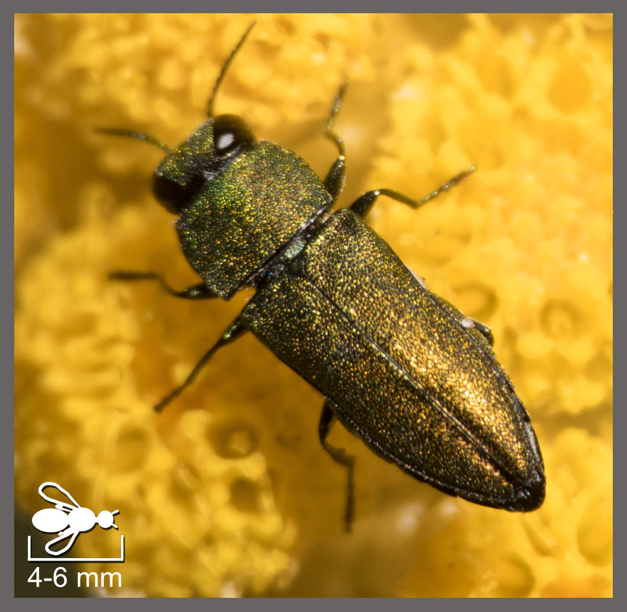 Agrile du chêne Agrilus angustulus (4,5-6 mm) Bupreste du rosier Coraebus rubi (8-10 mm) Coraebus undatus Coraebus undatus (10-14 mm) Petit Richard Trachys minutus (2-3 mm) Anthaxie fulgurante Anthaxia fulgurans (4,5-7 mm) Bupreste hongrois Anthaxia hungarica (7-15 mm) Anthaxie à élytres rouges Anthaxia ignipennis (6-7,5 mm) Anthaxia millefolii subsp. polychloros Anthaxia millefolii subsp. polychloros (4-6 mm) Anthaxie noire Anthaxia nigritula (4-5 mm) Bupreste hémorroïdal Buprestis haemorrhoidalis (15-20 mm) Bupreste à neuf taches Buprestis novemmaculata (13-20 mm) Capnode de l'Oseille Capnodis tenebricosa (13-20 mm) Capnode du Pêcher Capnodis tenebrionis (18-26 mm) Latipalpe à dos plat Latipalpis plana (20-25 mm) Acmaeodera bipunctata Acmaeodera bipunctata (4,5-5 mm) Bupreste dégénéré Acmaeodera degener (10-13 mm) Acméodère de la Piloselle Acmaeodera pilosellae (7-10 mm) Acmaeoderella adspersula Acmaeoderella adspersula (5-7,5 mm) Acméodère à fascies jaunes Acmaeoderella flavofasciata (7-11 mm) Ptosime à taches jaunes Ptosima undecimmaculata (7-13 mm)