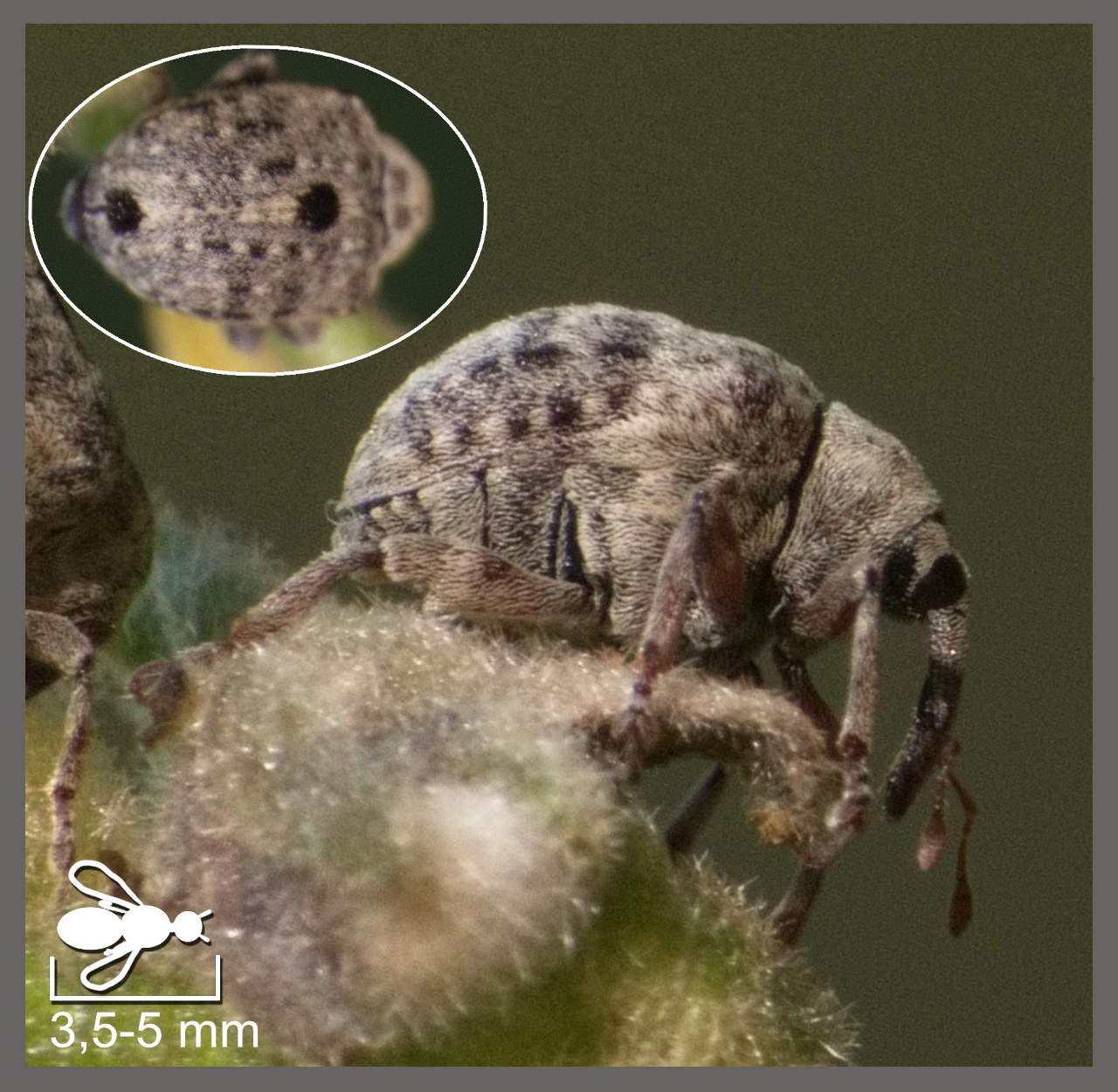 Charançon de l’iris des marais Mononychus punctumalbum (4-5 mm) Charançon de la Molène Cionus thapsus (3,5-5 mm) Balanin des glands Curculio glandium (6-9 mm) Dorytomus Dorytomus sp. (4-9 mm) Pachyrhinus de Lethierry Pachyrhinus lethierryi (5-6 mm) Charançon vert soyeux Polydrusus formosus (5-7 mm) Cléone excorié Coniocleonus excoriatus (11-14 mm) Larin de l'artichaut Larinus cynarae (20-24 mm) Larin des Maures Larinus maurus (6-8 mm) Larinus scolymi Larinus scolymi (9-15 mm) Lixe à marge blanche Lixus albomarginatus (7-13 mm) Lixe filiforme Lixus filiformis (4-12 mm) Lixe poudreux Lixus pulverulentus (12-18 mm) Hylésines du pin Tomicus piniperda-destruens (3,5-5 mm)
