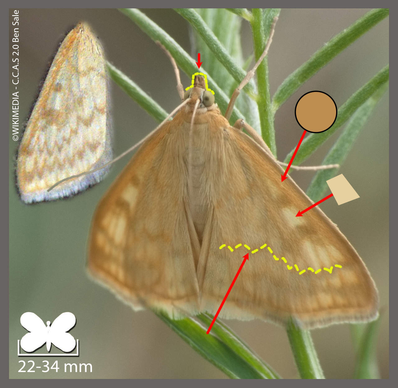 Crambus des tiges Agriphila tristella (22-30 mm) Crambus luctifère Catoptria luctiferella (20-24 mm) Odontie dentelée Cynaeda dentalis (21-31 mm) Botys de la traînasse Uresiphita gilvata (29-38 mm) Pyrauste de la Menthe Pyrausta aurata (12-16 mm) Pyrauste du Plantain Pyrausta despicata (14-20 mm) Botys vertical Sitochroa verticalis (22-34 mm) Pyrale du buis Cydalima perspectalis (35-45 mm) Pyrale de la Luzerne Nomophila noctuella (26-32 mm)