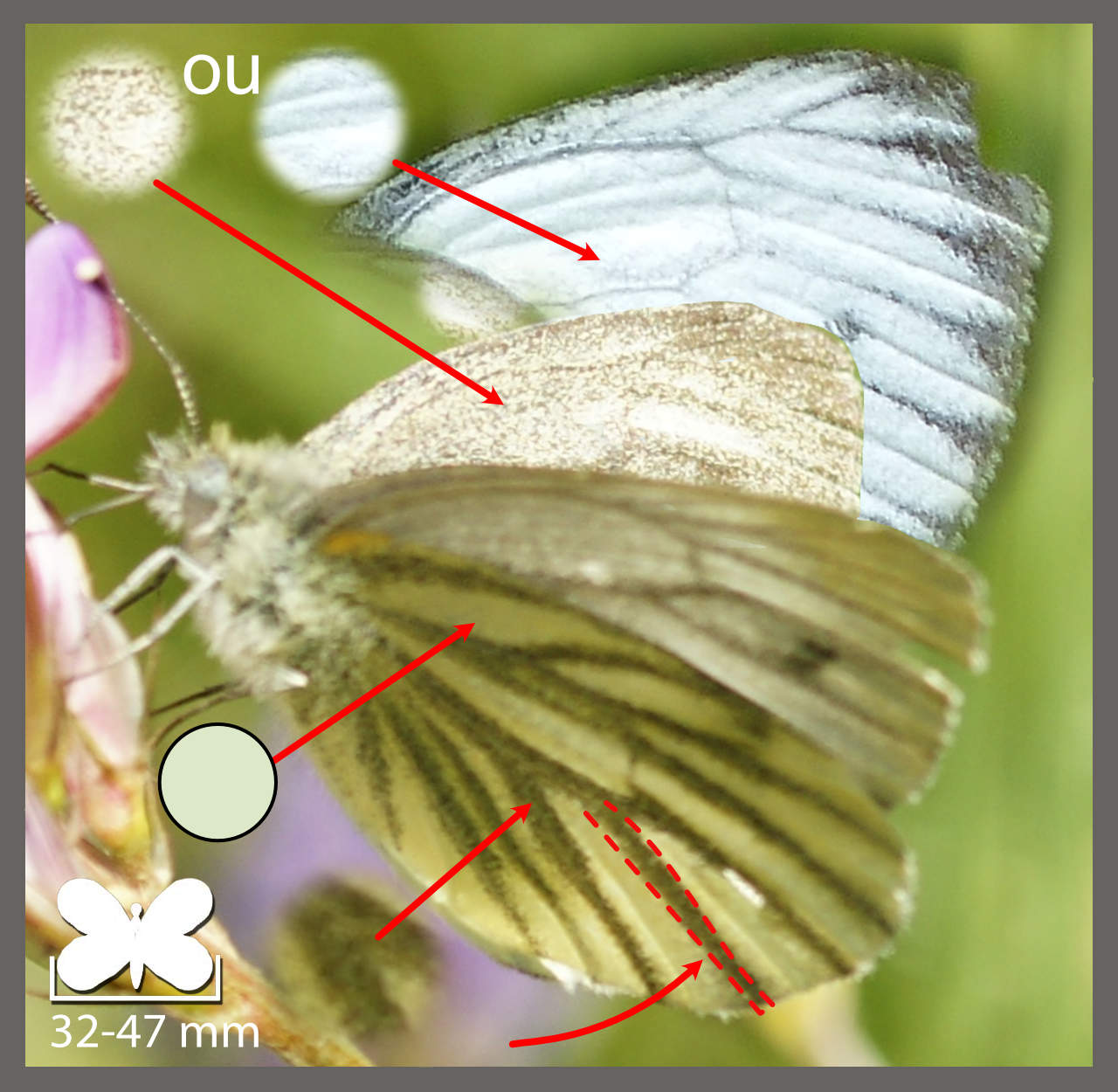 Fluoré Colias alfacariensis (35-50 mm) Souci Colias crocea (35-50 mm) Citron de Provence Gonepteryx cleopatra (50-60 mm) Citron Gonepteryx rhamni (50-60 mm) Aurore de la cardamine Anthocharis cardamines (35-50 mm) Aurore de Provence Anthocharis euphenoides (35-40 mm) Gazé Aporia crataegi (50-60 mm) Marbré de Cramer Euchloe crameri (40-48 mm) Piéride du Chou Pieris brassicae (49-63 mm) Piéride de l'arabette Pieris bryoniae (32-47 mm) Piéride de l'Ibéride Pieris mannii (40-46 mm) Piéride du Navet Pieris napi (32-50 mm) Piéride de la rave Pieris rapae (39-56 mm) Marbré de vert Pontia daplidice (38-45 mm)